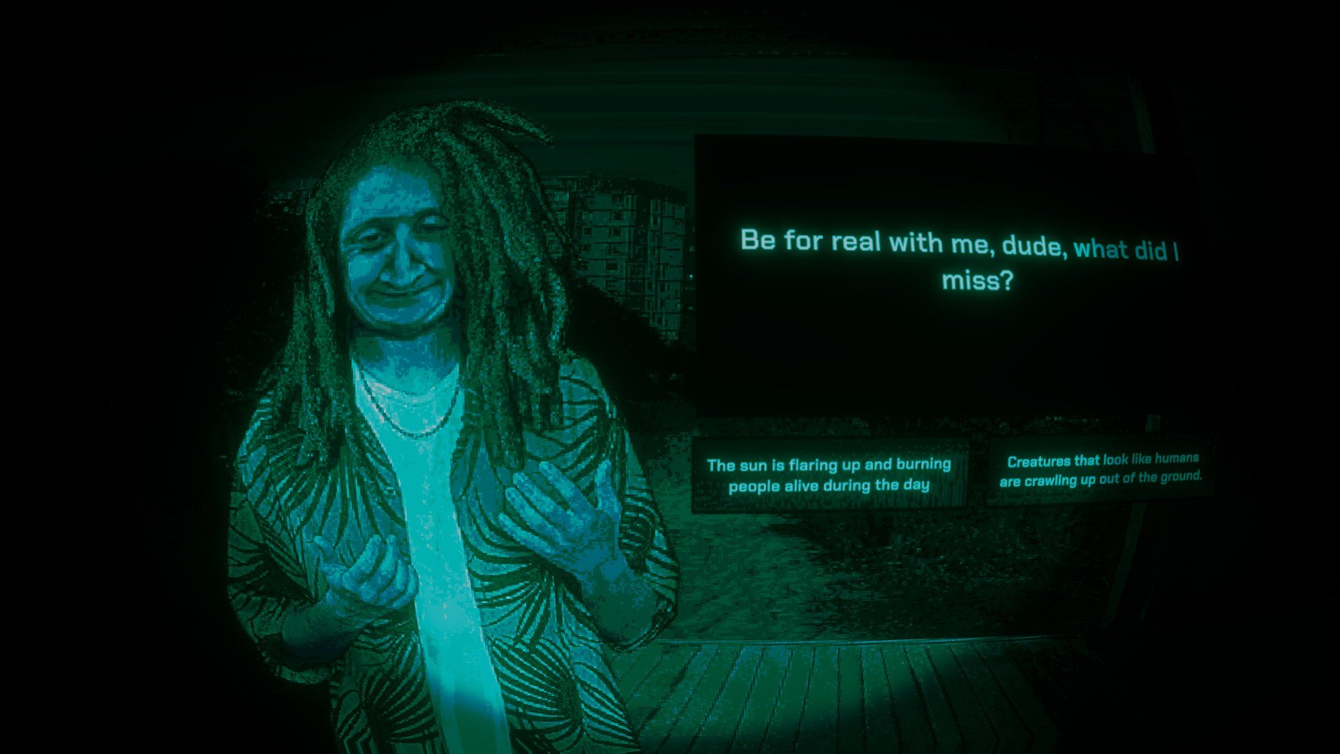 The world is ending. Acrid aromas of sun-scorched streets fill the air. Blackened corpses gnarled into shapes of agony line the streets. Stay inside. Lock your doors. Close the blinds. Only let humans in. Eliminate all Visitors.