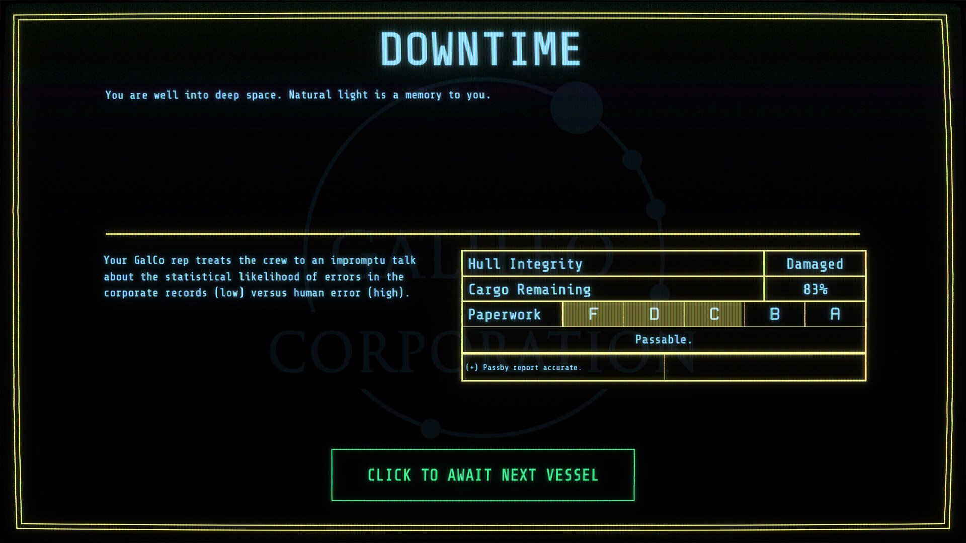 Humanity has spread throughout the solar system and started extracting its natural resources. You are the security officer aboard PALE HORSE, a Galileo Corporation vessel carrying miners set for Ganymede, Jupiter's biggest moon. It’s your job to assess the intentions of approaching ships, decide their fate, and keep your crew alive. The company is watching.