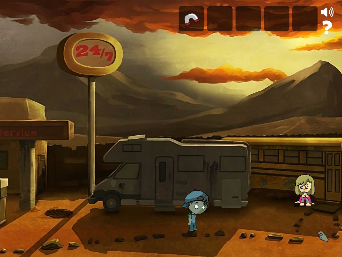 As limited as the environments are, visually the game is pretty, using watercolor (relying heavily on orange and beige) to effectively portray the (presumably) post-apocalyptic setting. It’s pretty easy to tell what everything is, and the cursor changes from a pair of footprints to a hand when you hover over something you can interact with. There is minimal animation apart from Zomboy walking, and one brief cutscene halfway through involving two of the characters that is a bit out of nowhere and creates a potential conflict that is never addressed again. Outside of a few sound effects there is not much to listen to either, music or otherwise. All dialogue is written.