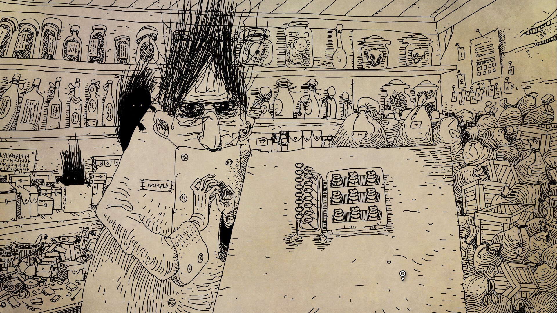 While your tasks tend to be straightforward—taking missing objects back to where they belong, collecting puzzle pieces to open locks, finding something to trade a character whose item you need—the challenge often lies in just identifying and tracking down what you’re actually looking for. I’d estimate there are more than a thousand screens to cover, each one chock full of elaborate visual detail with no color to break it up. Even in relatively uncluttered rooms, I sometimes overlooked what turned out to be important details. Still, this sets up a number of immensely satisfying a-ha! moments in which you’ll suddenly recognize, at long last, the one element missing from a puzzle that’s nagged at you for hours.