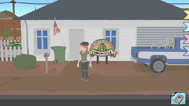 The sign at the edge of town shows a population of only 12, but there are more people than that roaming around the distinct separate districts of Cantaloupe and its surrounding regions. However, you can only interact with some of them as you explore such locales as a cabin by a lake, the police department, a neighboring town, and a drive-in cinema (each becoming available for its related news story).